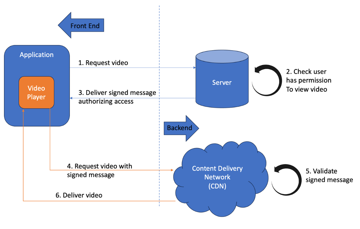 The choice of CDN and the mechanism for signing/validating messages is governed by the aforementioned video infrastructure providers. Many use signed JWTs.