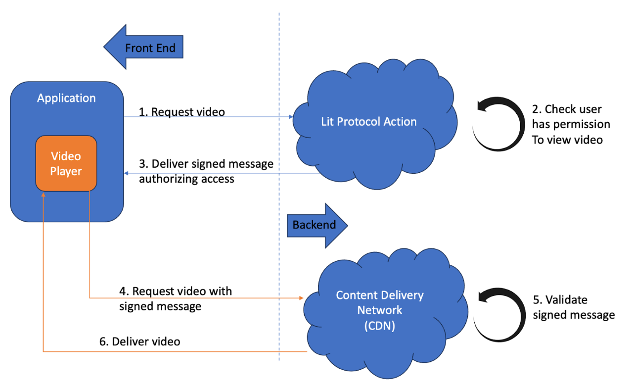 The centralized server in the video-as-a-service example has been replaced by a Lit Action, javascript code that is stored on IPFS and executable by Lit nodes. The Lit Action checks the user has permission to view the video and signs a message. This architecture eliminates the burden for the creator to maintain any backend infrastructure. Building front-end apps is easier than building full stack apps.