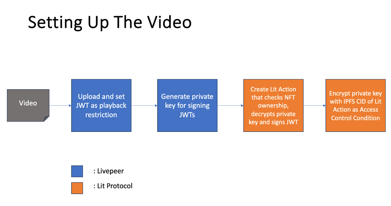 The video is uploaded to Livepeer’s CDN with a JWT playback restriction, meaning the video can’t be played unless the user has a valid signed JWT. After generating a private key for signing JWTs, a Lit Action is uploaded to IPFS. The action does the following: