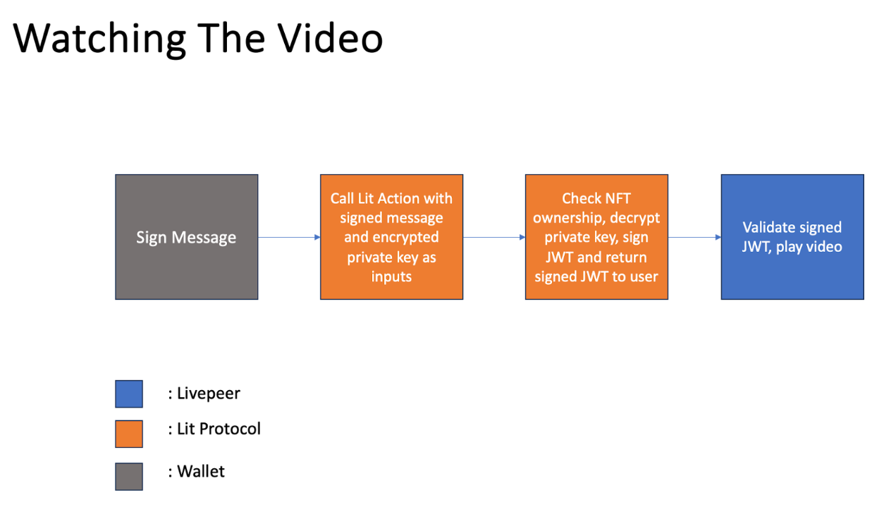 When the user wants to watch the video, they sign a message and pass the message and encrypted private key to the Lit Action. If the user meets the criteria for watching the video, the Lit Action returns a signed JWT.